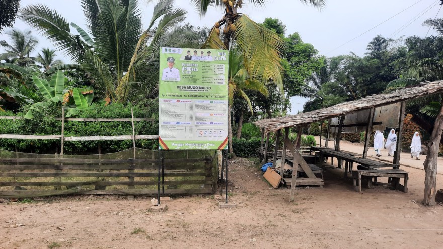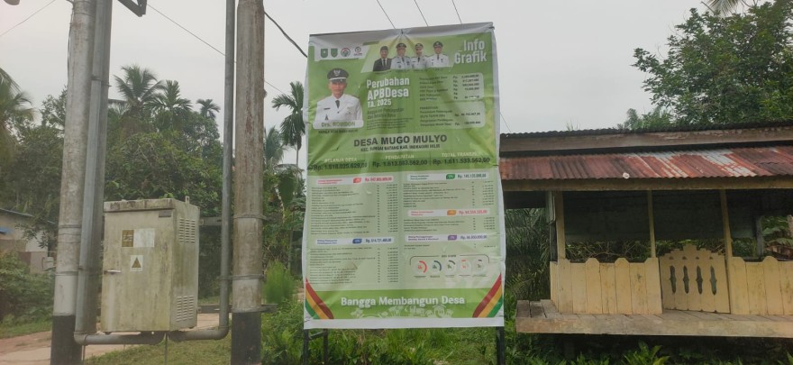 PPID - MUGO MULYO. Pemerintah Desa Mugo Mulyo Tingkatkan Transparansi Pengelolaan Anggaran melalui Publikasi APBDes Pemerintah Desa Mugo Mulyo, Kecamatan Sungai Batang, Kabupaten Indragiri Hilir berkomitmen untuk meningkatkan transparansi dan akuntabilitas dalam pengelolaan Anggaran Pendapatan dan Belanja Desa (APBDes). Komitmen ini diwujudkan melalui pemasangan banner transparansi dan infografis APBDes tahun anggaran 2025. Langkah ini diambil untuk memberikan informasi yang jelas dan mudah dipahami oleh masyarakat terkait penggunaan Anggaran Desa. Pemasangan banner dan infografis tersebut dilakukan pada tanggal 29 April 2025 di beberapa titik strategis yaitu di depan Kantor Desa Mugo Mulyo dan jalan utama masuk Desa Mugo Mulyo di Dusun Mugomulyo 1, dusun Mugomulyo 2 dan Dusun Persatuan.
